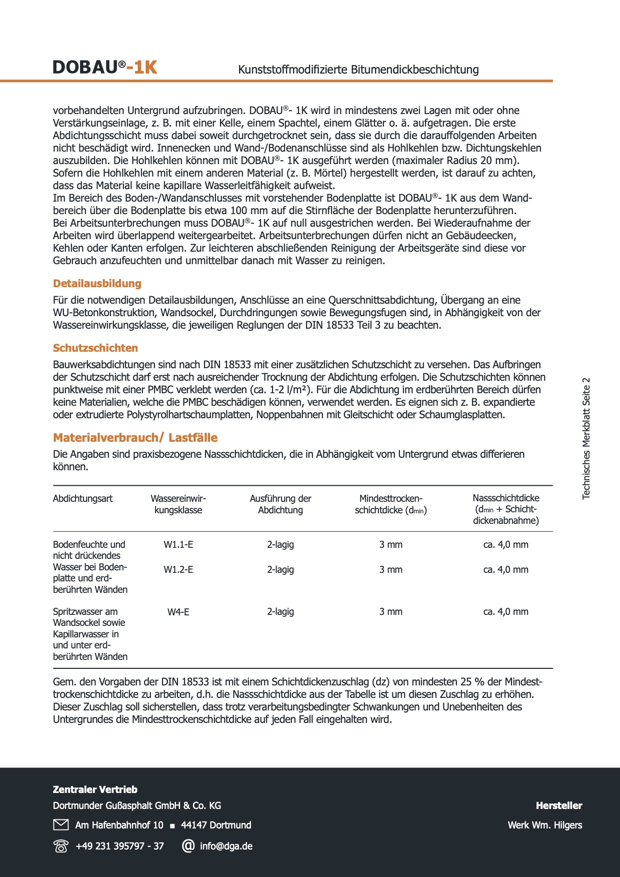Die einkomponentige, kunststoffmodifizierte Bitumendickbeschichtung DOBAU®- 1K ist mit Polystyrolschaum gefüllt und verfügt über eine pastöse, thixotrope Form. Daher eignet sie sich besonders zur Herstellung von dauerhaften Außenabdichtungen von Bauwerken gegen Bodenfeuchte und nicht drückendes Wasser sowie an Bodenplatten und an Wänden von erdberührten Bauteilen (W1.1-E, W1.2-E). Darüber hinaus hat sich DOBAU®- 1K bei der Abdichtung gegen Spritzwasser am Wandsockel und Kapillarwasser in und unter erdberührten Bauteilen (W4-E) sowie bei der Verklebung von Hartschaum-Dämmplatten im erdberührten Bereich bewährt.