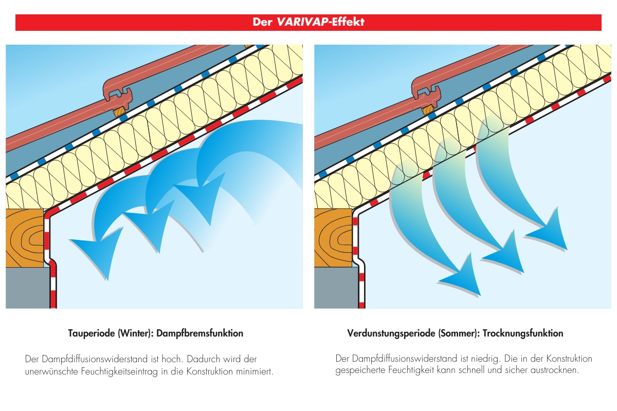 Durch den VARIVAP-Effekt passt die Bahn ihren Diffusionswiderstand an die Umgebungsfeuchte an: