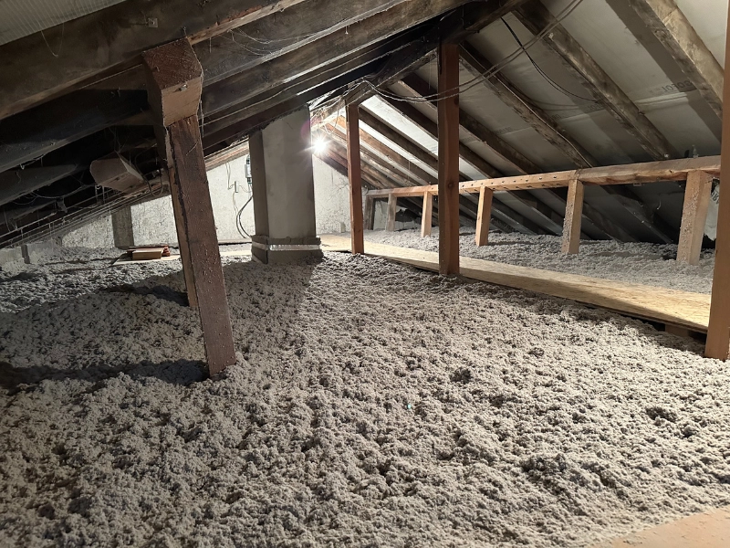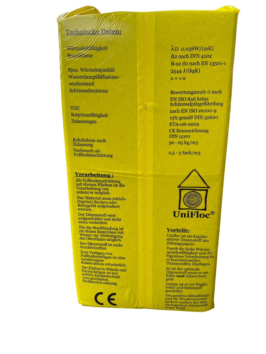 Unifloc is a loose, capillary-active cellulose fibre insulation made from sorted daily newspaper paper. As a loose-fill floor insulation, it is ideal for timber joist floors, attic areas and top-floor ceilings: loosen – pour – level. The material creates a near-joint-free insulation layer and supports balanced moisture behaviour.